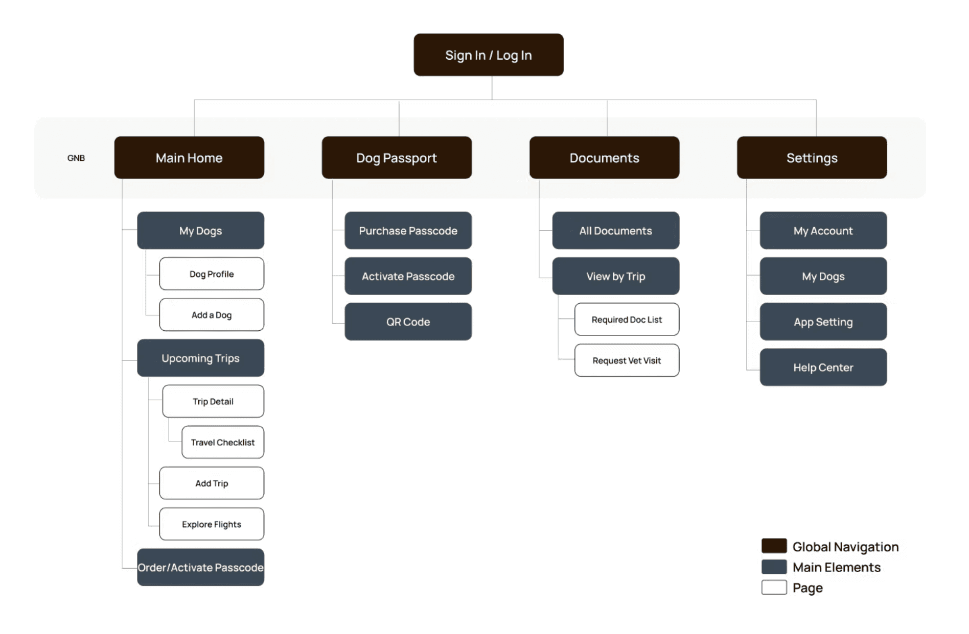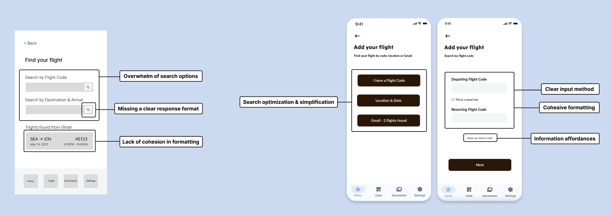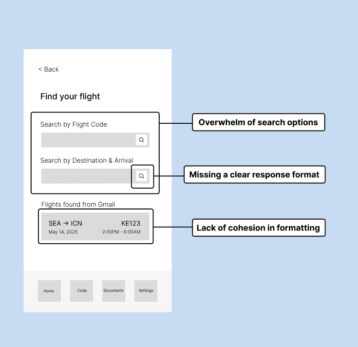 To identify the essential components for creating the user application, our team developed an information architecture (IA) that focused on the key features surrounding flight lookup and documentation access.