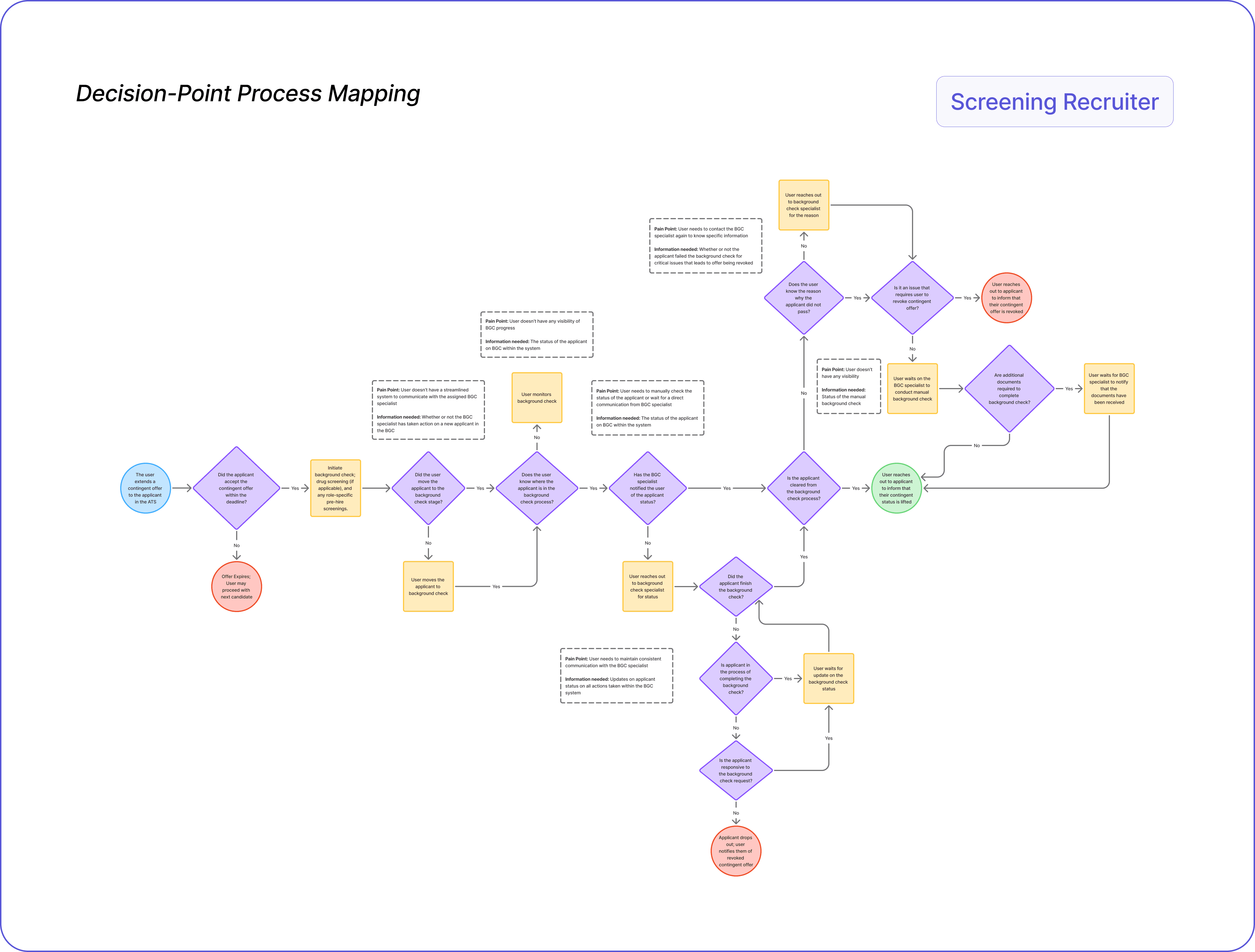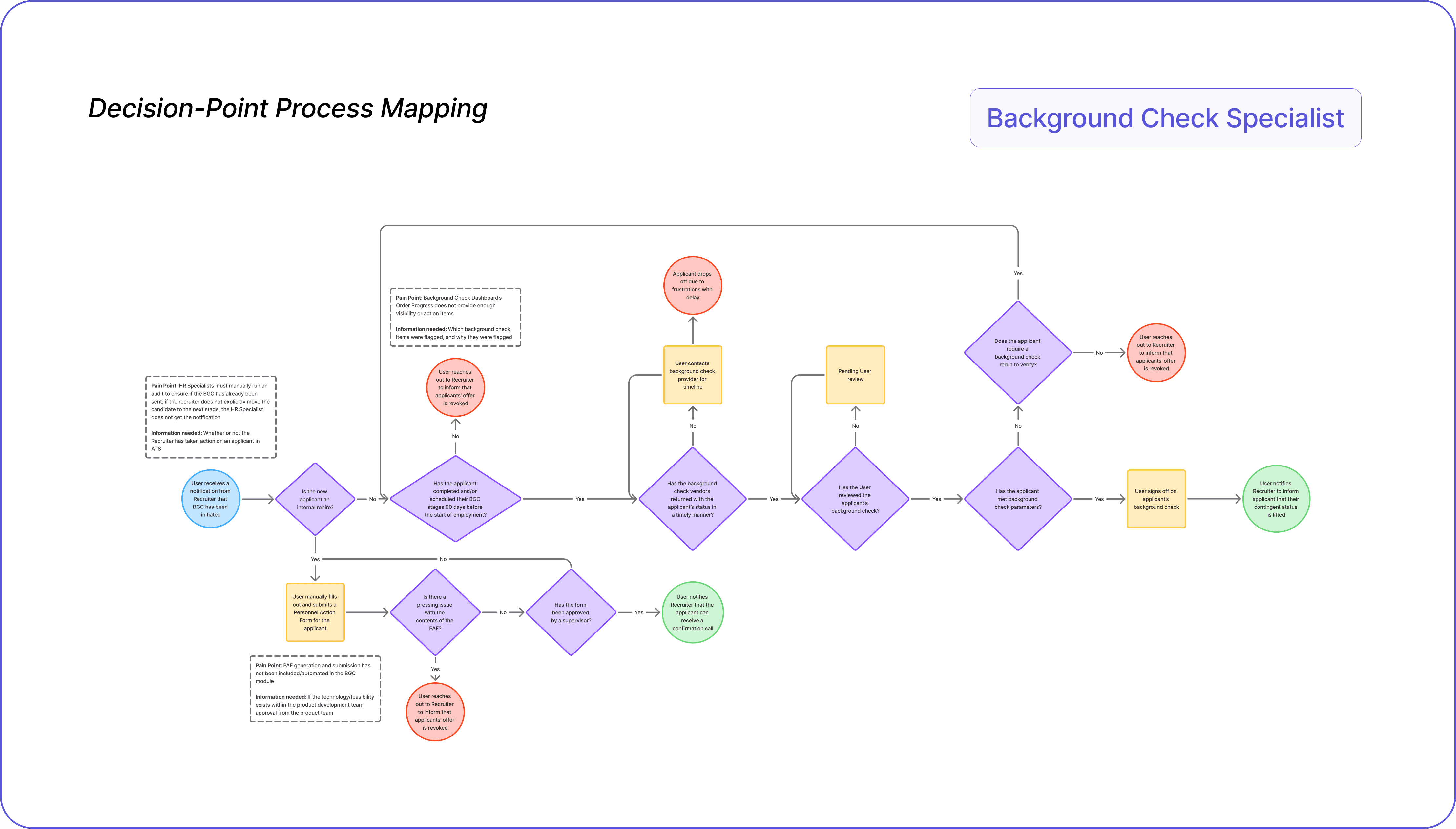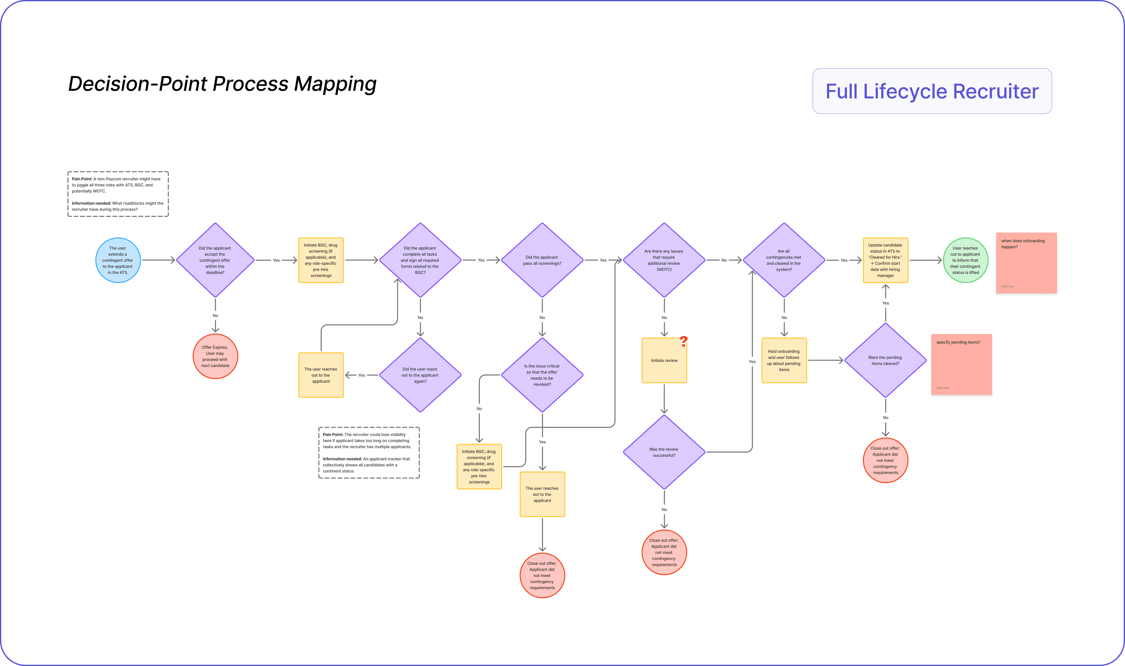 I interviewed four hiring specialists across different roles (Full Lifecycle Recruiter, Screening Recruiter, Background Check Specialist, & WOTC Specialist), revealing varied workflows that informed a more inclusive and adaptable design. We learned that WOTC specialist was not a major stakeholder to these products, allowing us to focus on the initial three roles.