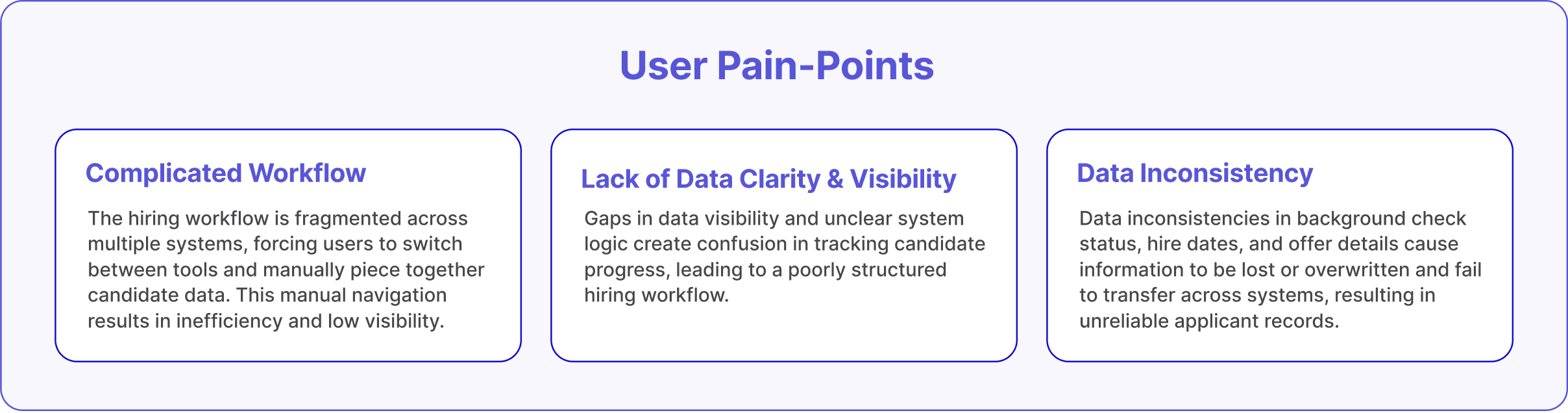 Our team compiled 84+ product experience feedback tickets within Jira, expressing pain-points with complicated workflows, data inconsistency, and the lack of clarity & visibility throughout the existing pre-hire onboarding tools.